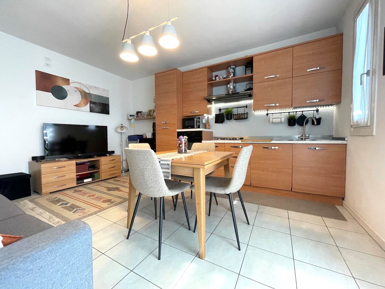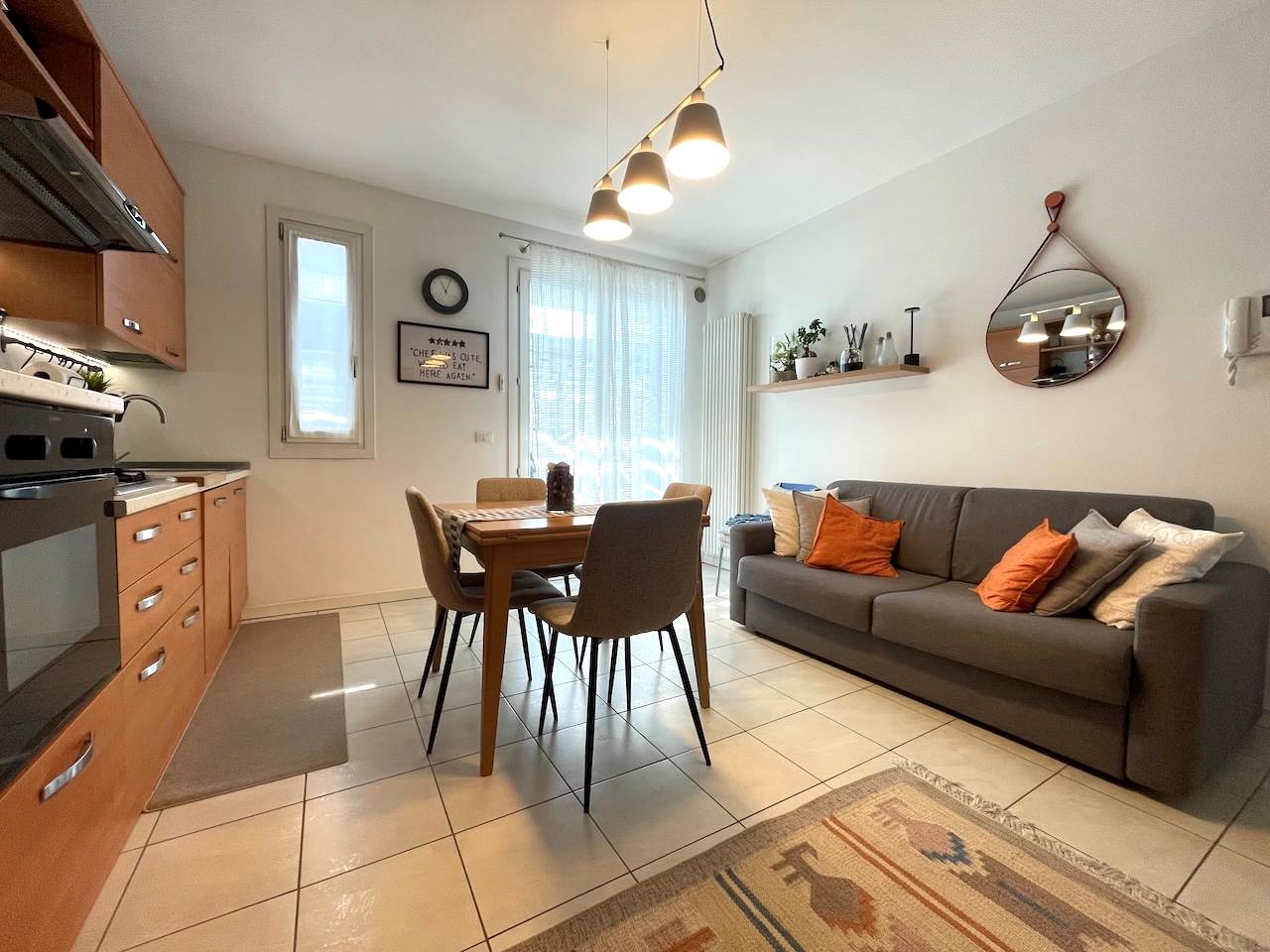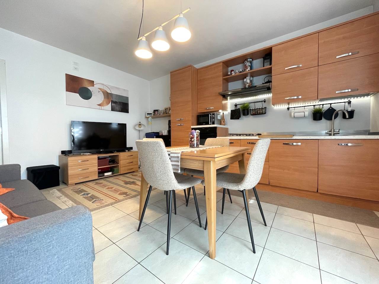 L'appartamento è composto da un luminoso living con cucina a vista, che si affaccia su un terrazzo di ampie dimensioni completo di barbecue, è l’ideale per serate conviviali, per pranzi e cene o anche solo per una piccola colazione, con esposizione a sud e vista sulla piscina, il terrazzo è completo di tenda esterna elettrica con funzione di antivento.