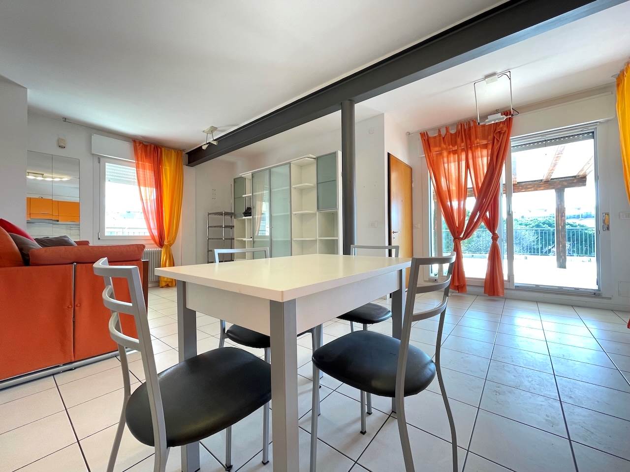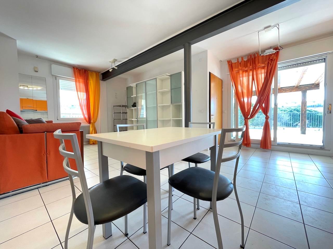 L’ingresso si apre nell’ampio soggiorno completo di un comodo divano letto e una ulteriore struttura a libreria che con facilità diventa un altro letto matrimoniale, l’angolo cottura è funzionale e perfetto per organizzare cene con gli amici, in casa oppure sullo splendido terrazzo, perfetto per le feste all’aperto, con il mare come panorama sullo sfondo.