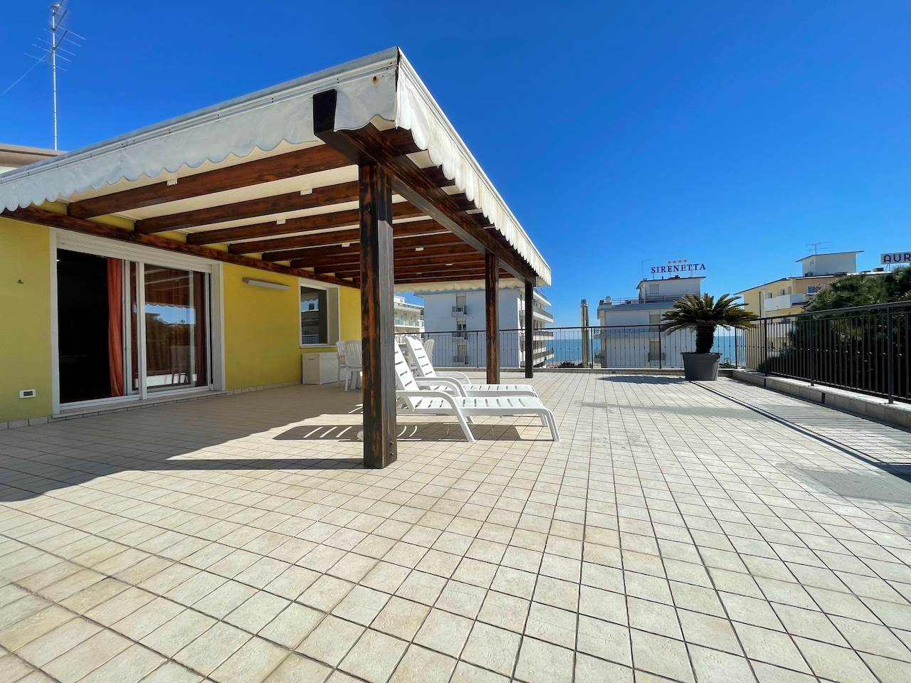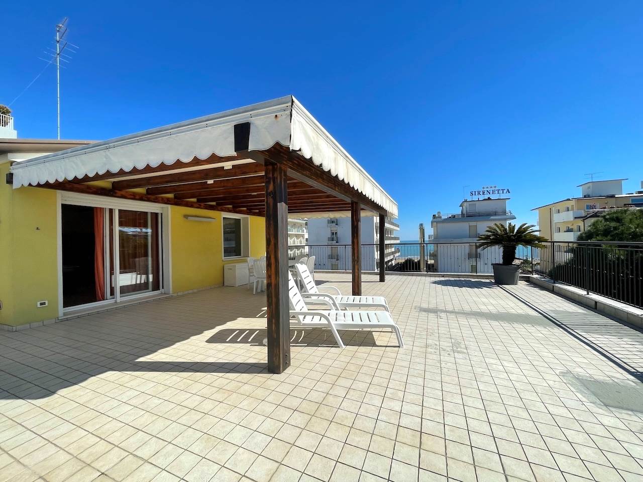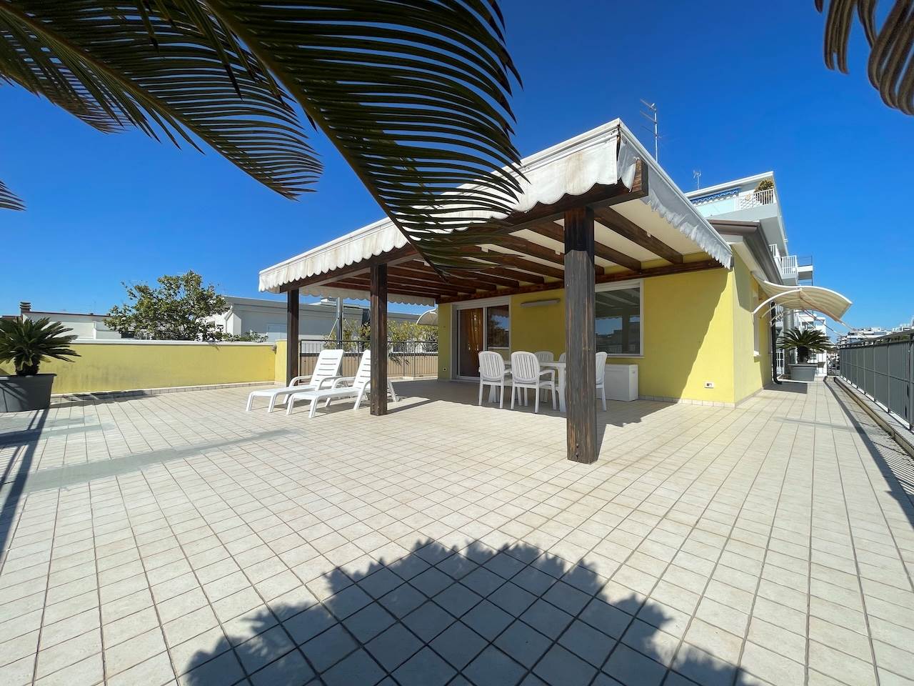 All’esterno troviamo l’ampio terrazzo che è il vero cuore dell’appartamento, perfetto per ricevere gli amici, per prendere il sole in assoluta privacy, per godere del mare nella quiete della propria abitazione, per una vacanza riposante e davvero esclusiva.