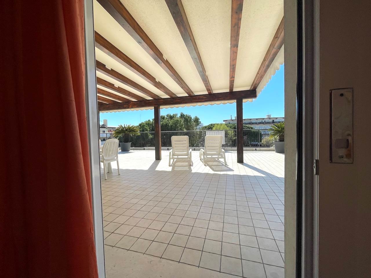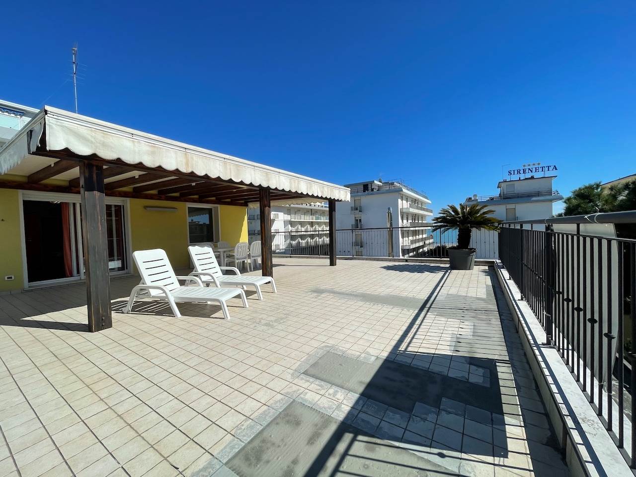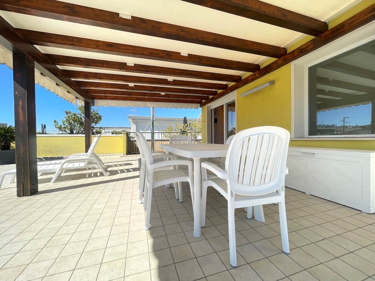 All’esterno troviamo l’ampio terrazzo che è il vero cuore dell’appartamento, perfetto per ricevere gli amici, per prendere il sole in assoluta privacy, per godere del mare nella quiete della propria abitazione, per una vacanza riposante e davvero esclusiva.