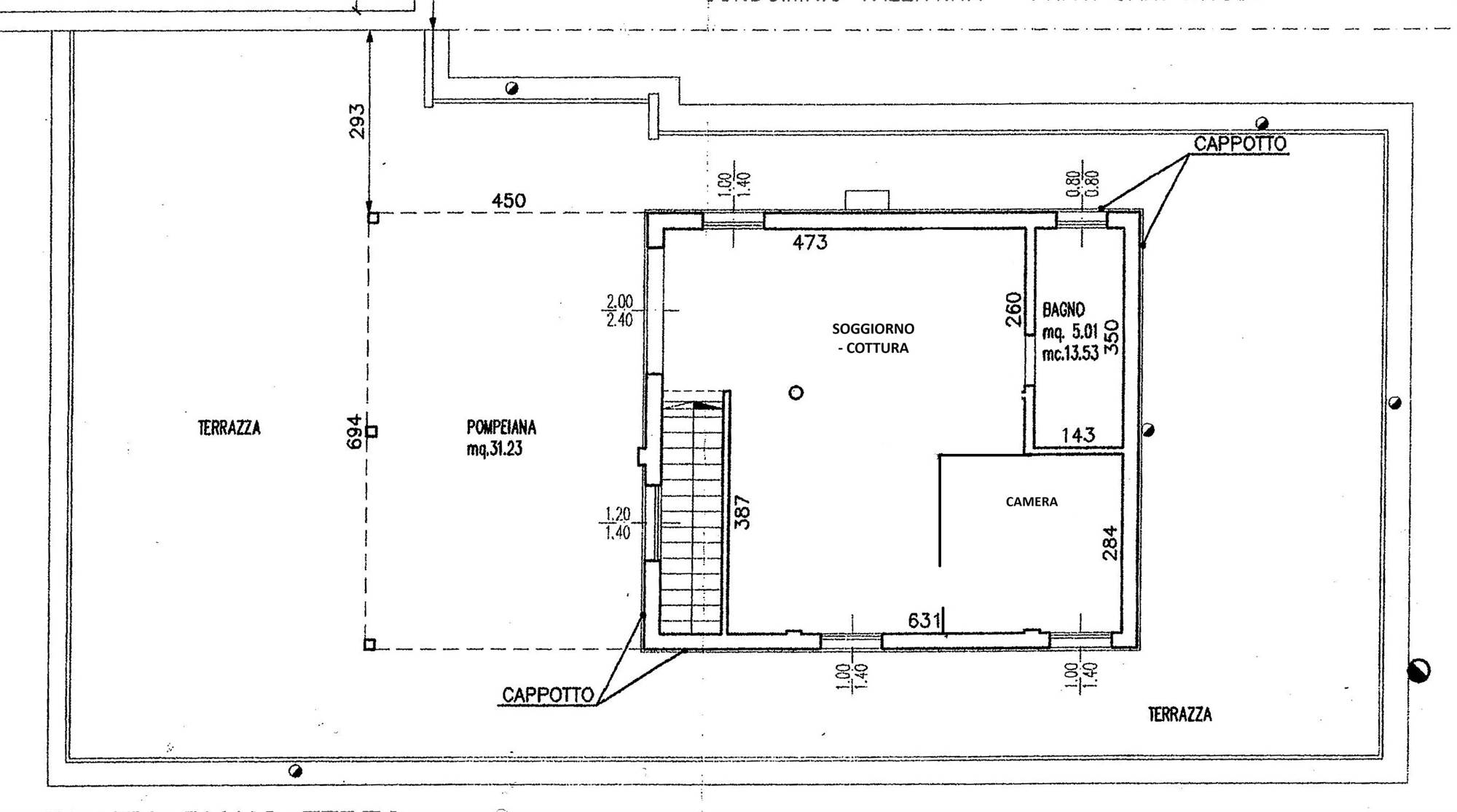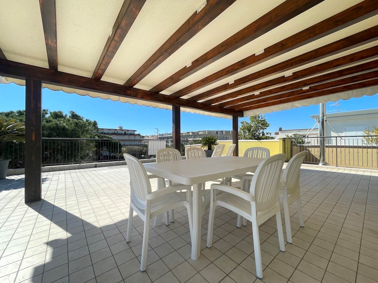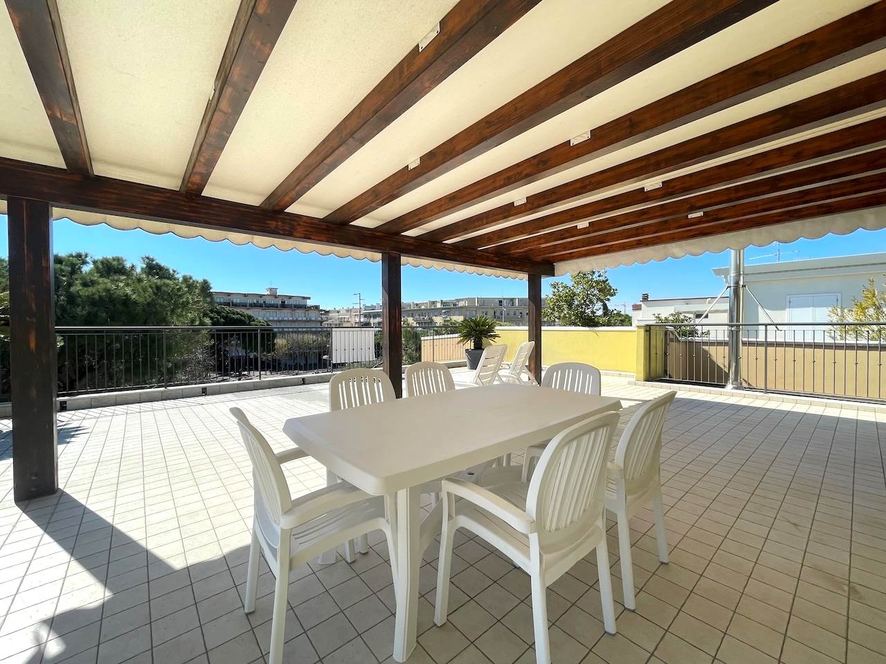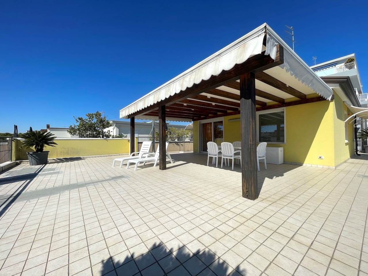 Lo spazio esterno misura mq.130 ed è parzialmente coperto da una pompeiana di legno che può essere verandata per creare un giardino d’inverno, non ci sono pertinenze esterne dedicate, ma nella via adiacente c’è un parcheggio pubblico dove si può parcheggiare comodamente con abbonamento nel periodo estivo, mentre nel resto dell’anno la piazza ha numerosi parcheggi pubblici e gratuiti, avvisiamo che il pavimento del terrazzo necessiterà a breve di manutenzione.